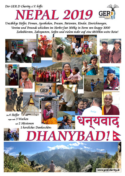 Nach langer Planung ist Dr. Baum wieder gemeinsam mit seinem Freund und GER.D Charity Gründer Dr. Mathys im Herbst nach neunjähriger Pause endlich wieder in Nepal gewesen. Gemeinsam mit den Freunden Dr. Matthias Halm und Christoph Schuster nahmen Sie den Weg in den Himalaya auf sich, nahmen neben Motivation und Know-How die zuvor als Spenden gesammelten fast 300kg in Form von knapp 3000 Zahnbürsten, Zahnpasten und Seifen sowie unzähligen Behandlungsinstrumenten und Materialien und halfen, wo sie konnten. Fast 7000km entfernt mussten sie insgesamt 160km durch die Berge laufen, um knapp 400 Patienten zu behandeln.